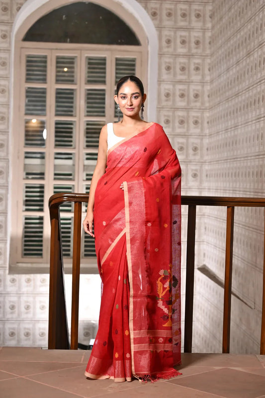 Handloom Crimson Red Pure Linen Zari Jamdani Saree