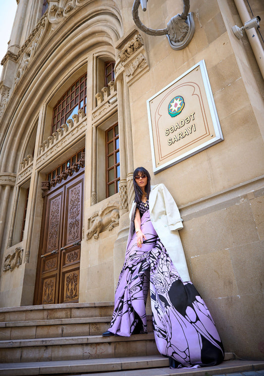 Orchid Purple Abstract Stripes Kubik Print Satin Saree