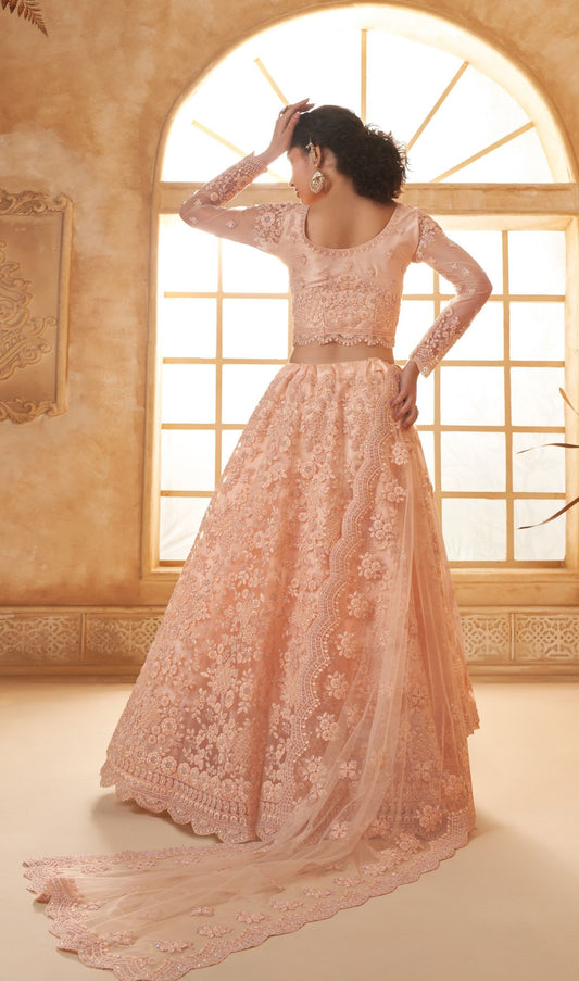 Peach Heavy Cording Embroidered Net Bridesmaid Lehenga Choli