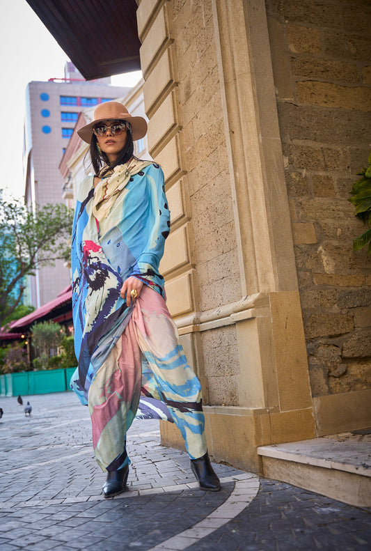 Blue and Green Floral Kolombus Satin Georgette Printed Saree