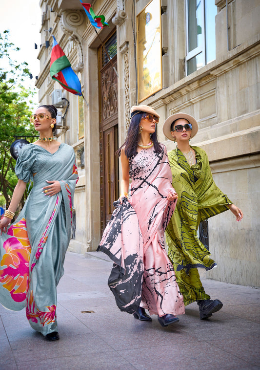 SIlver Orange Floral Kubik Print Satin Saree