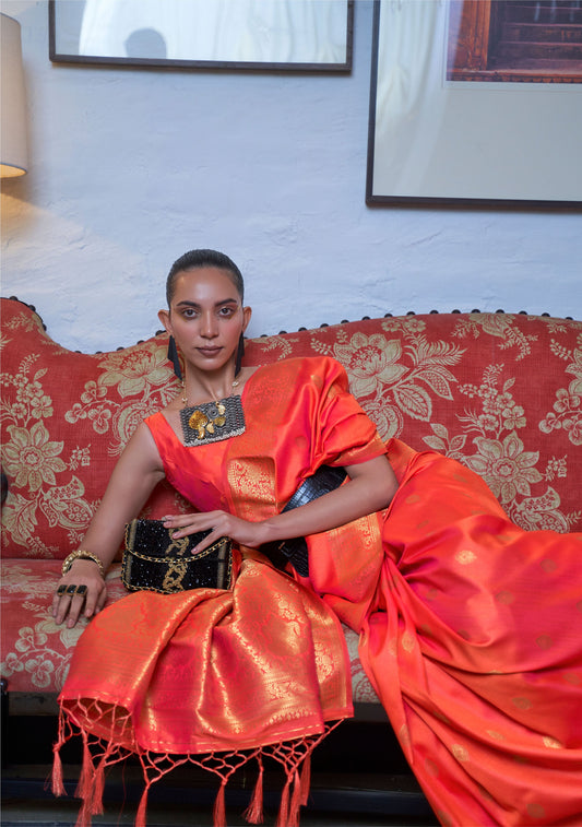 Tangerine Orange Kanyaatha Moss weave handloom silk saree