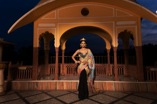 Tantuja Inspired Traditional Floral Nakshi Jaal Work Soft Jamdani Saree in Beige, Indigo, Black and Multicolored