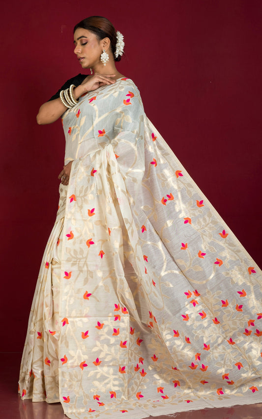 Tantuja Inspired Traditional Woven Floral Nakshi Soft Jamdani Saree in Buff, Red, Orange, Yellow, Mustard and Off White