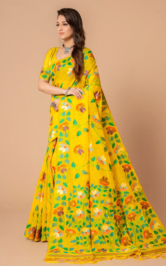 Tantuja Inspired Traditional Soft Jamdani Saree in Yellow, Green and Multicolored Nakshi Thread Weave