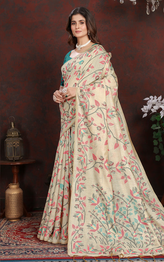 Tantuja Inspired Traditional Floral Nakshi Jaal Work Soft Jamdani Saree in Beige, Hot Pink and Multicolored