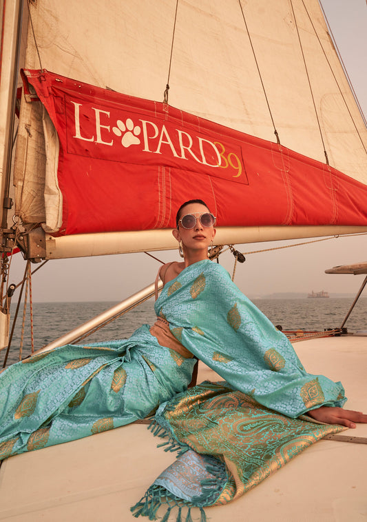 Turquoise Kronicle Pure Satin Zari Handloom Saree