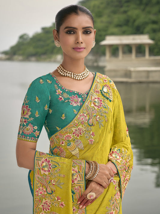 Yellow Pure Viscose Jacquard Khatli, Zari Embroidered Haldi Saree