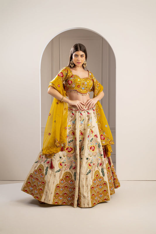 Bumblebee Yellow Heavily Embroidered Raw Silk Lehenga Set