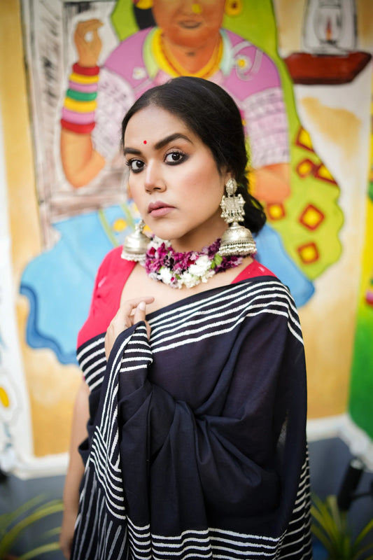 Coal Black - Handblock Print Natural Dyed - Mulmul Cotton Saree