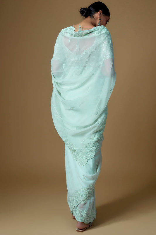 aqua organza embroidered saree