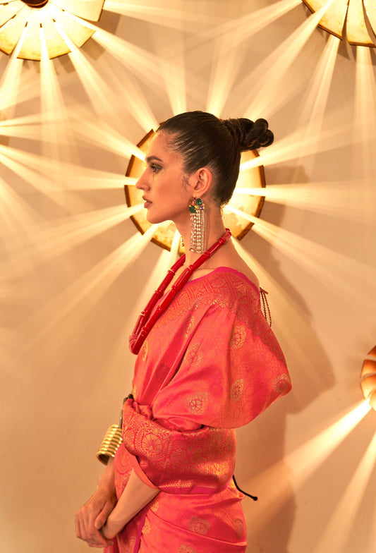 Coral Pink Karadhya Pure Satin Handloom Saree
