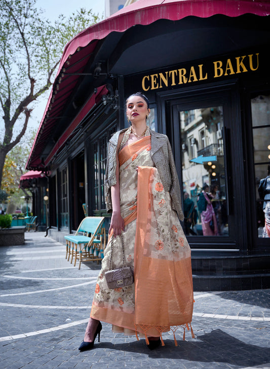 Cream and Orange Kinsel Printed Poly Handloom Saree