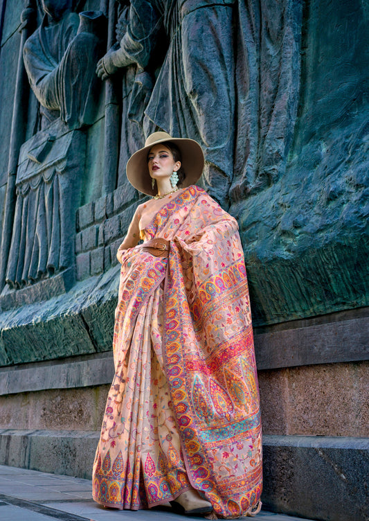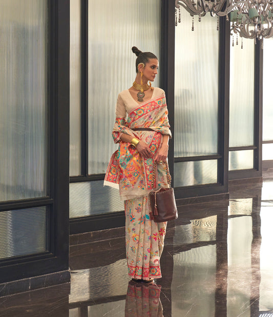 Cream Kashmiri Handloom Silk Weave Saree