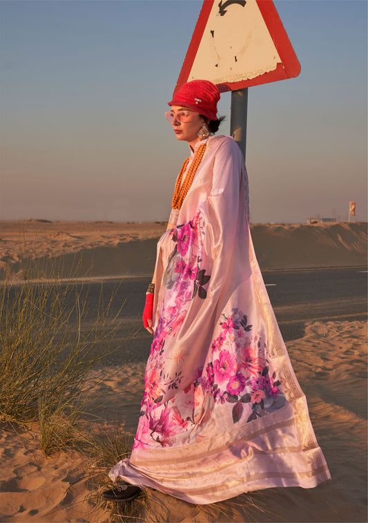 Cream Keeyah Printed Handloom Zari Tissue Saree
