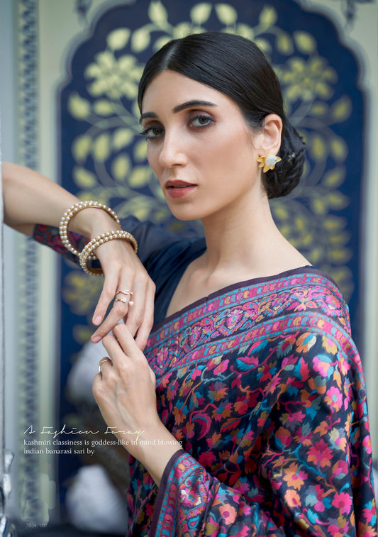Dark Blue Kashmiri Khyber Handloom silk Saree