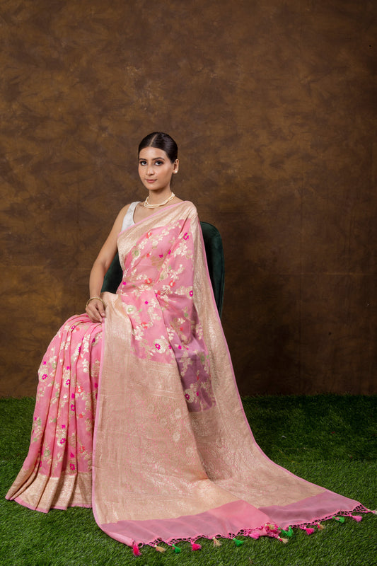 Baby Pink Georgette Khaddi Pure Silk Saree