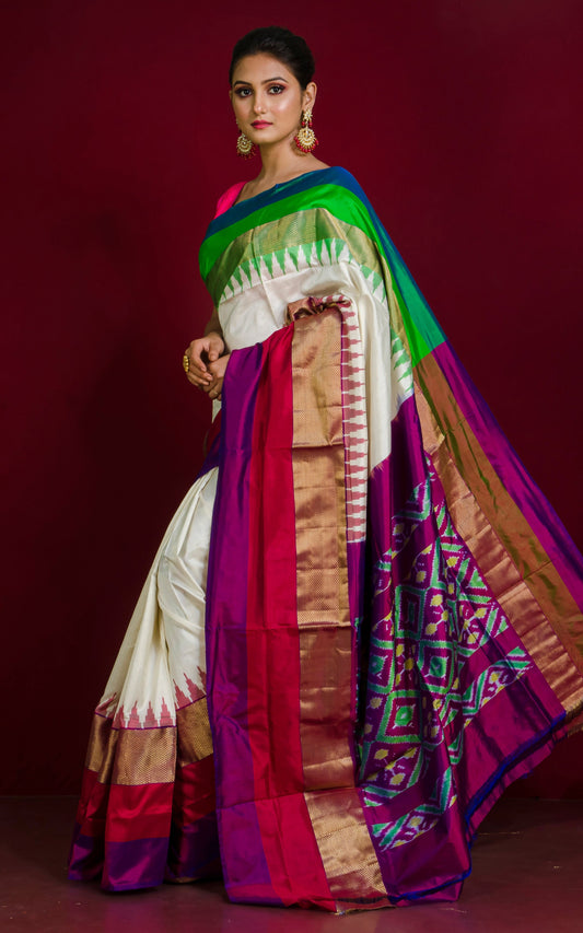 Designer Skirt Border Ikkat Pochampally Silk Saree in Off White and Multicolored