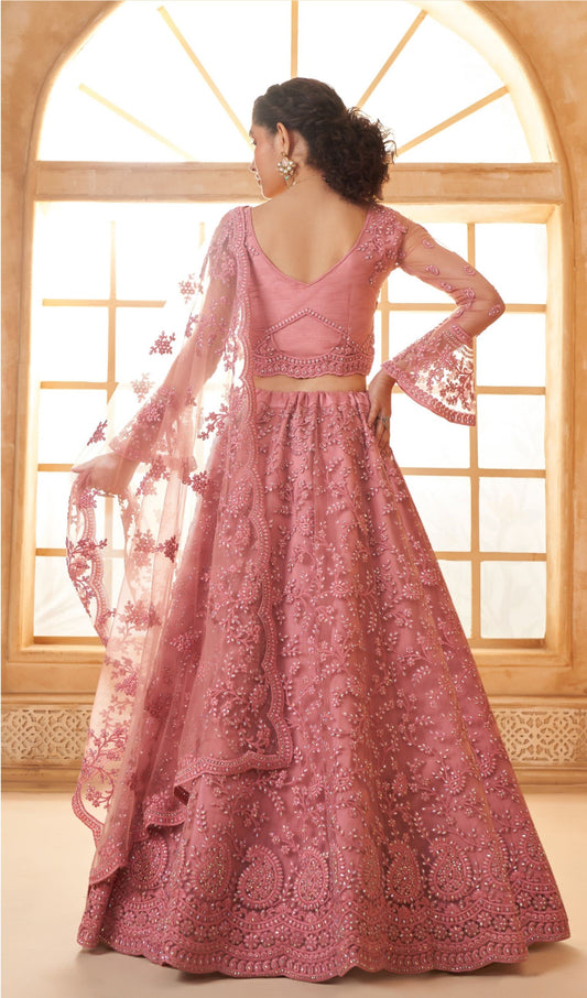 Dusty Pink Soft Net Embroidered Lehenga With Diamond Work