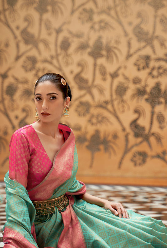 Green and Pink Kamsaara Bamboo Copper Zari Handloom Saree