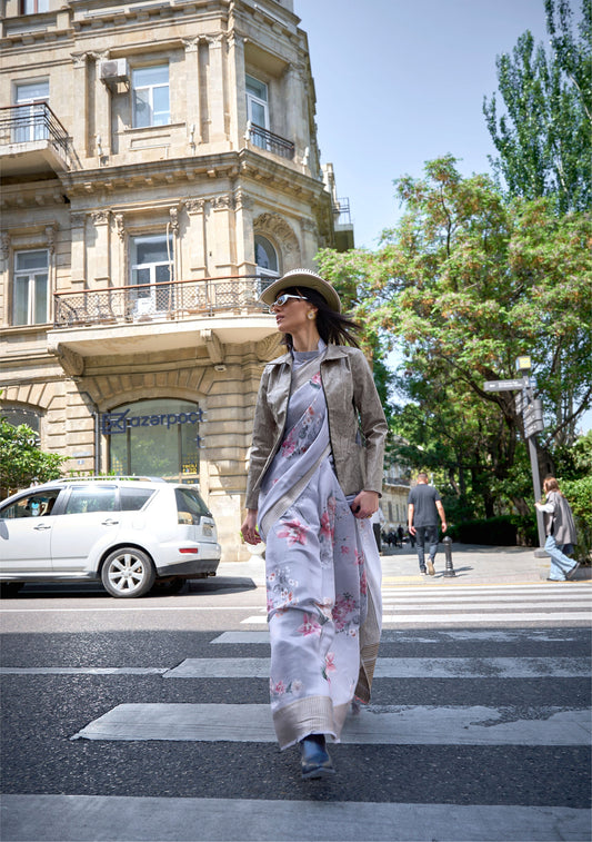 Grey Floral Klora Satin Crepe Digital Print Saree