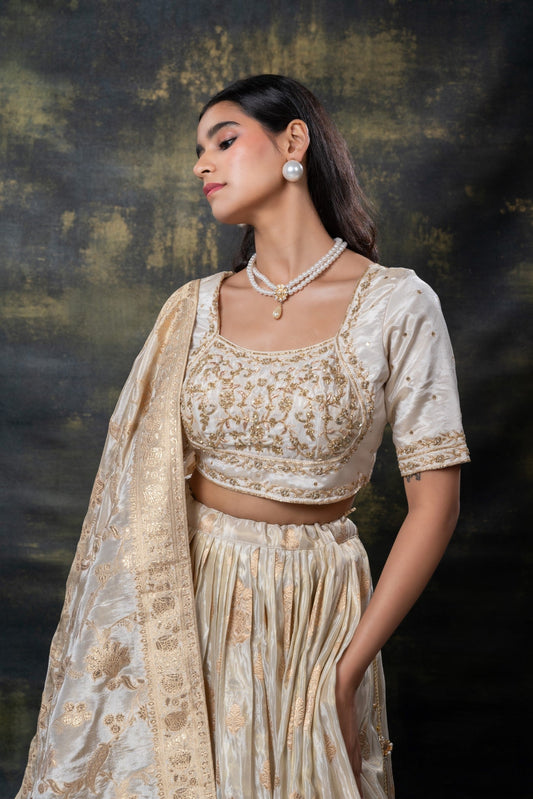 Ivory Slub Silk Printed And Embroidered Floral Round Lehenga Set
