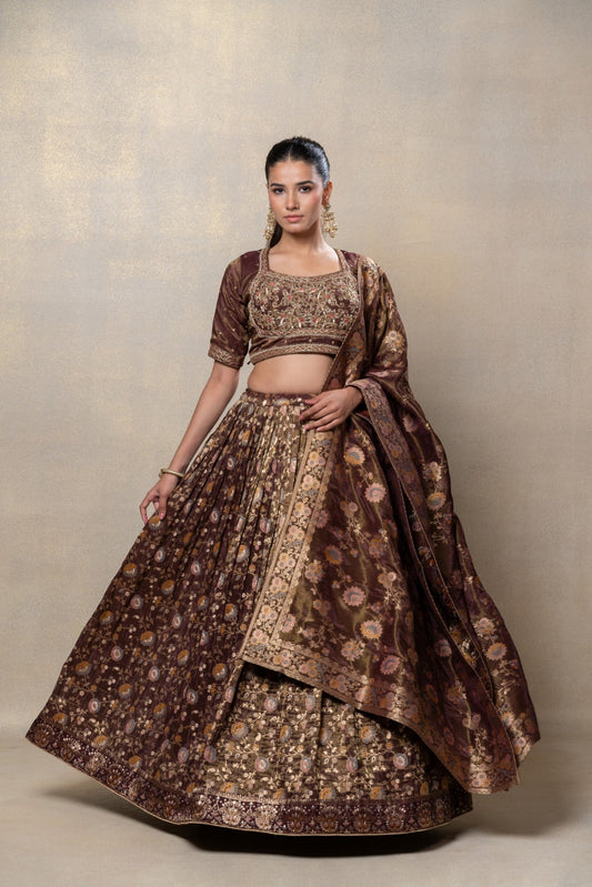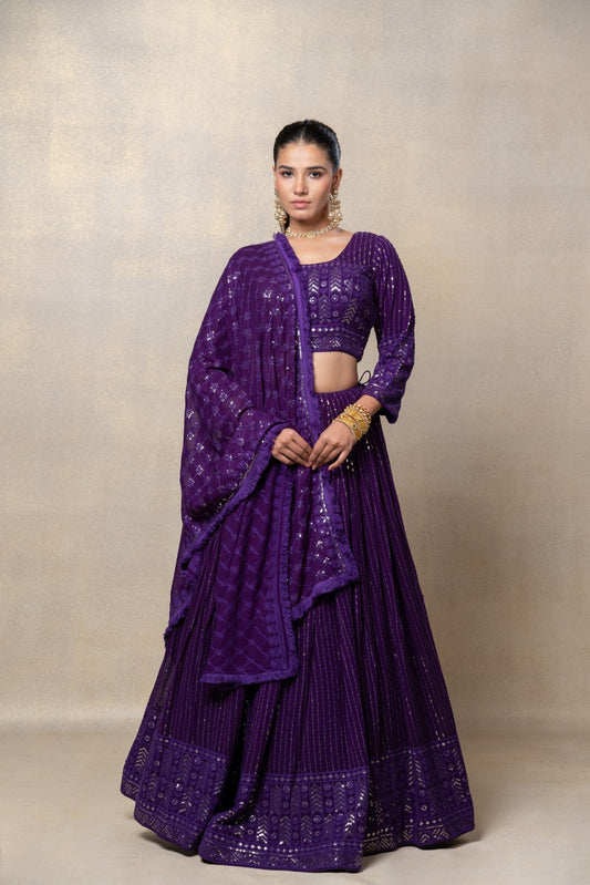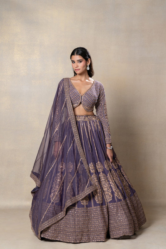 Rich lilac mirror and zari embellished soft silk lehenga set