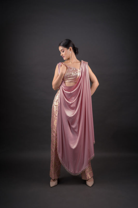 Hot pink Gharara Pants paired with abstract printed crop-top and long cape