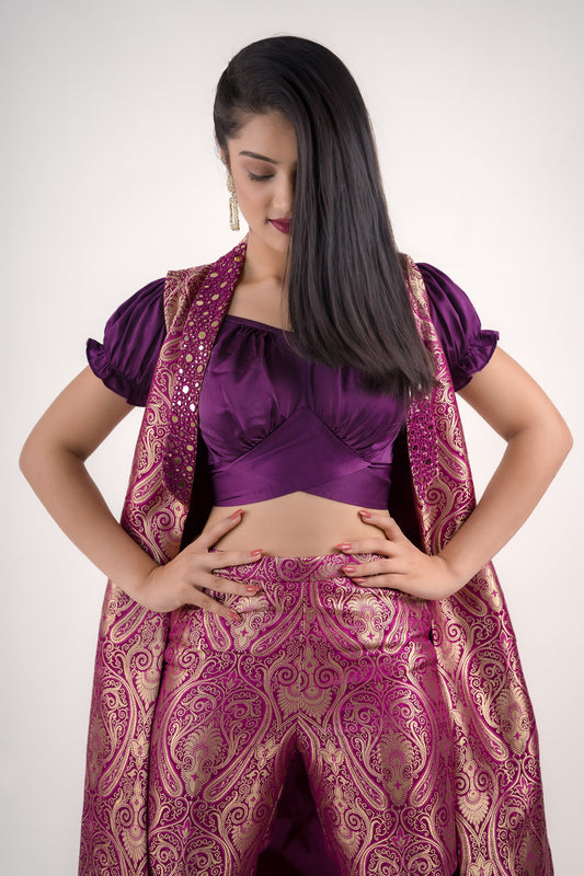 Royal Purple Crop Top with Ideal Brocade Sleeveless Long Open Jacket & Cigar Pants