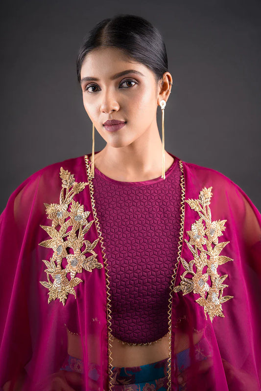 Wine Scalloped Edge Quilted Crop-Top with Draped Floral Skirt
