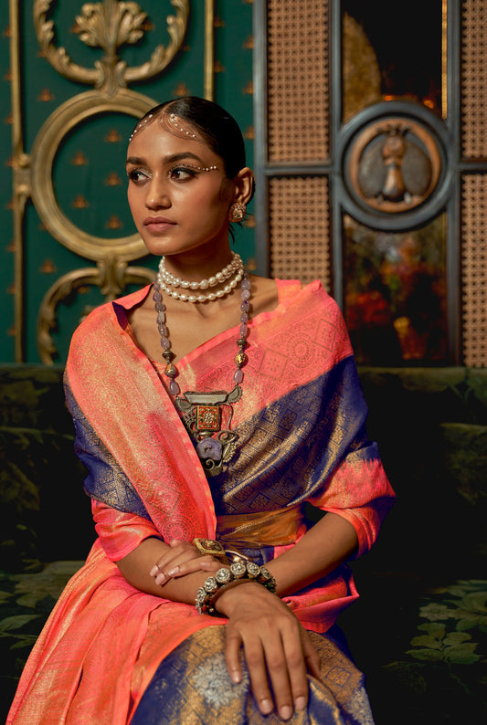 Coral Pink Karadhya Pure Satin Handloom Saree