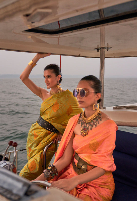 Yellow Kokoro Satin Two tone handloom weaving saree