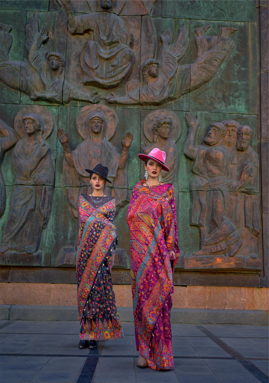 Navy Blue Kashneer Organza Kashmiri Handloom Silk Saree