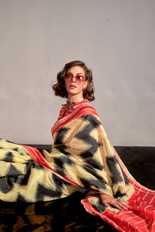 Yellow Keeyah Printed Handloom Zari Tissue Saree