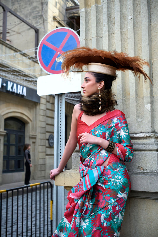 Pink FLoral Kazule Contemporary Satin Crepe Saree