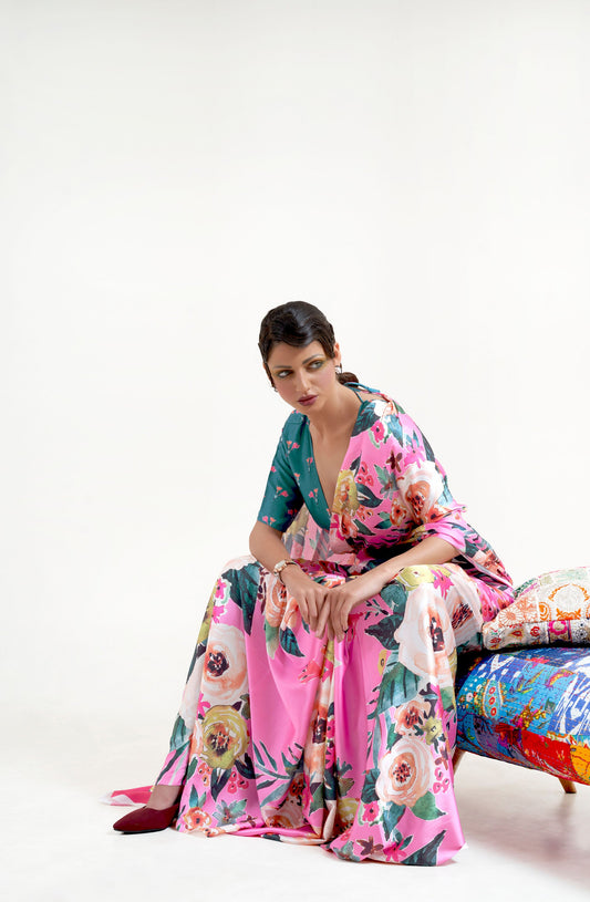 Pink Kazo Digital Soft Crepe Printed Saree