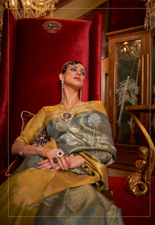 Metallic Blue Yellow Kshimmer Silk Handloom Saree