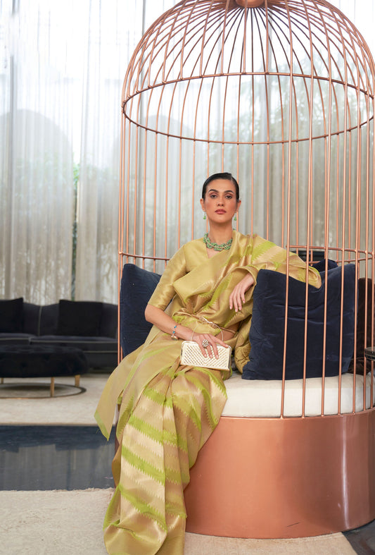 Olive Green Kelena Organza Lehriya Handloom Saree