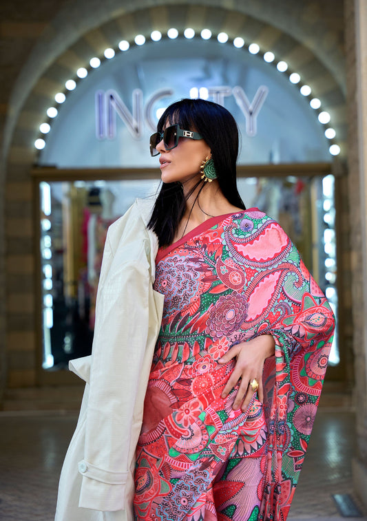 Pink Multi Pattern Klora Satin Crepe Digital Print Saree
