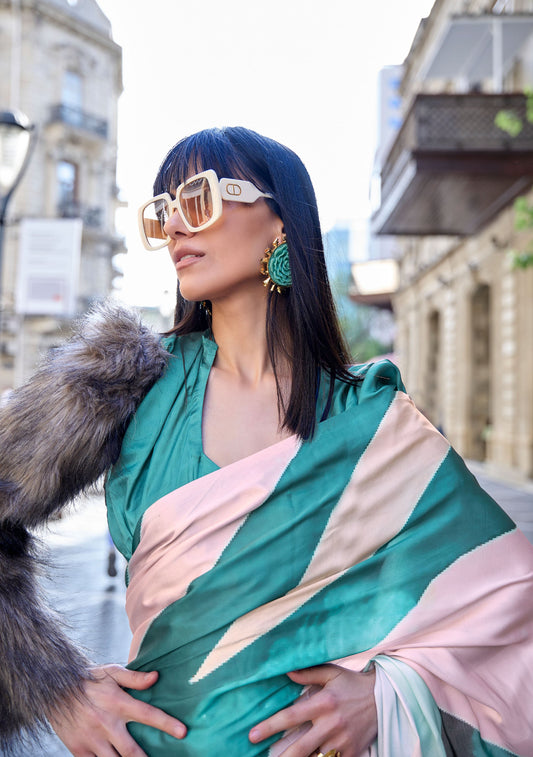 Blue Pink Klora Satin Crepe Digital Print Saree