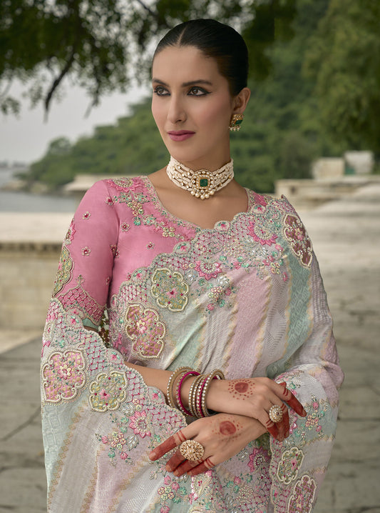 Pink and Sea Green Pure Viscose Jacquard Khatli, Zari Embroidered Saree
