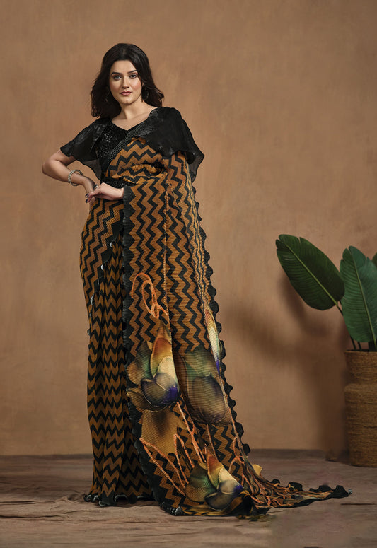 Orange & Black Satin Silk Readymade Digital Printed Saree