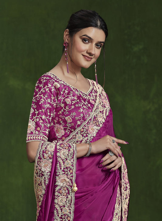 Wine and Gold Zari Organza Silk Khatli work Saree