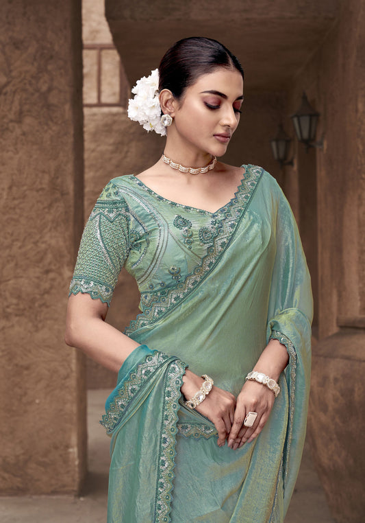 Sea Green Satin Silk Hand Embroidery Party Wear Saree