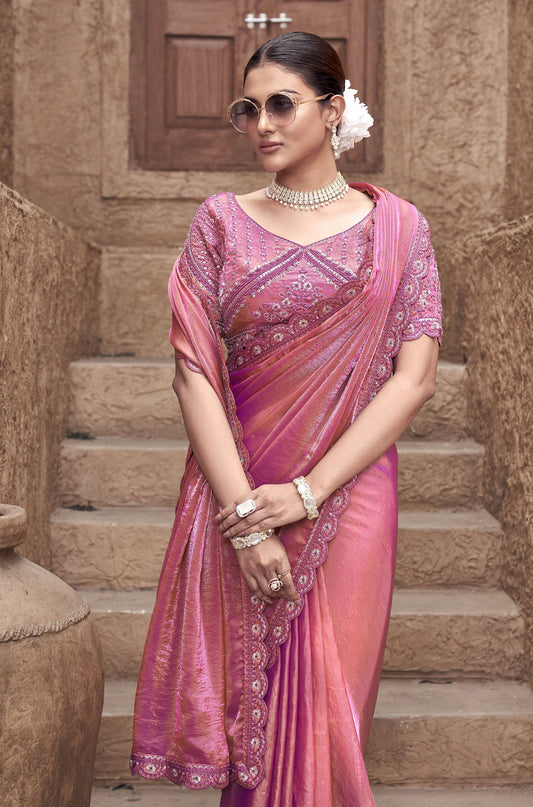 Pink Satin Silk Hand Embroidery Party Wear Saree