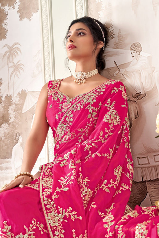 Fuchsia pink organza silk saree with matching unstitched blouse