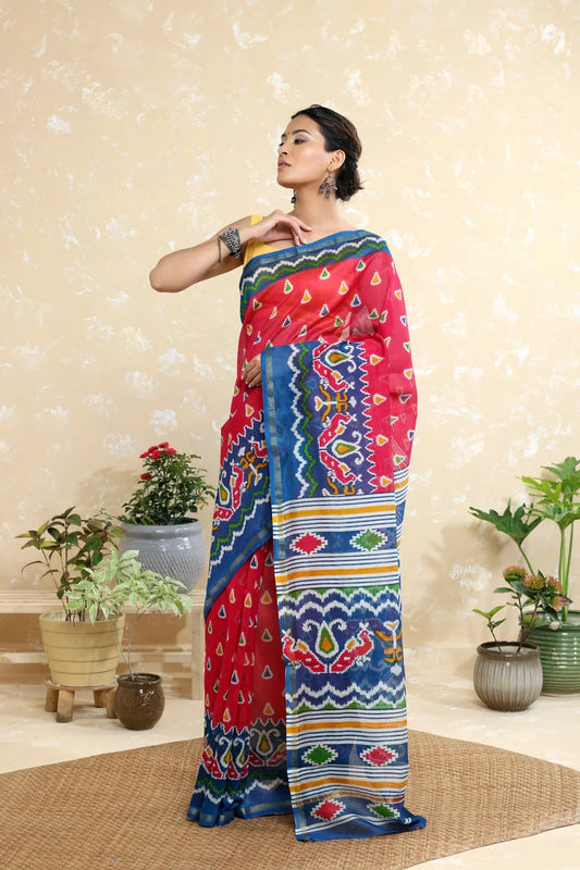 Handloom Black & Red Block Print Chanderi Cotton Saree