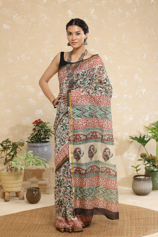 Handloom Vanilla Cream Block Print Chanderi Cotton Saree
