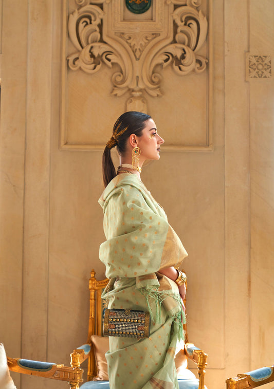 Pista Green Kyaari Silk Tissue Zari Khicha Zari Handloom Saree