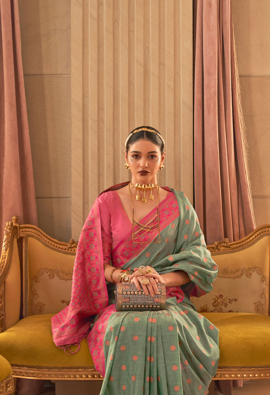 Green and Pink Kamsaara Bamboo Copper Zari Handloom Saree